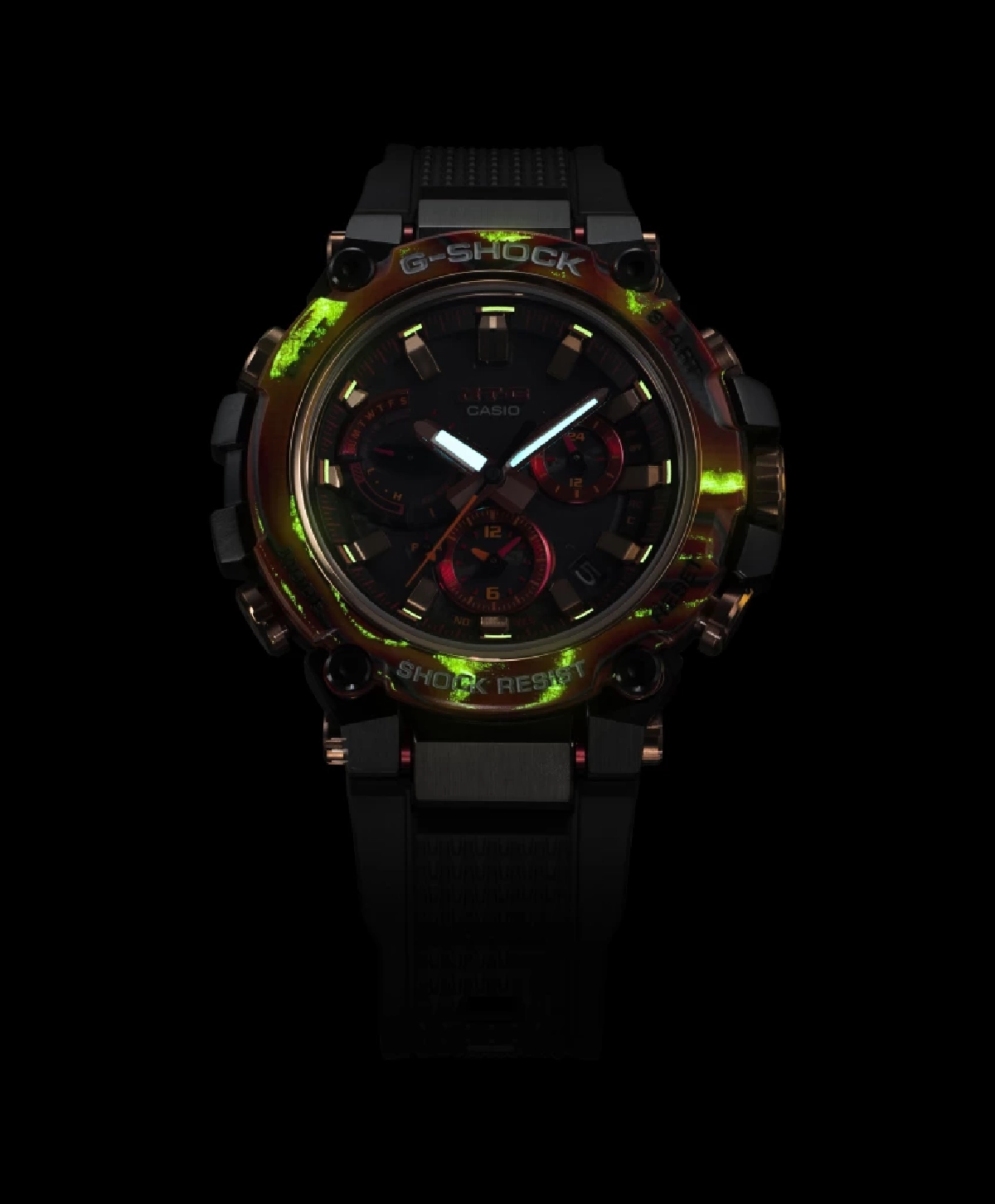 มาเริ่มกันที่เรือนแรกภายใต้คอนเซ็ปต์ G-SHOCK 40th ANNIVERSARY FLARE RED คือ G-SHOCK MTG-B3000FR จากตระกูล G-SHOCK Premium ซึ่งเป็นที่รู้จักกันดีในเรื่องการผสมผสานวัสดุ โลหะ คาร์บอน และเรซิน เข้าไว้ด้วยกันได้อย่างลงตัว ทำให้นาฬิกามีความแข็งแรงและทนทานมากยิ่งขึ้น โดยนาฬิการุ่นนี้จะโดดเด่นด้วยลวดลายบนหน้าปัดที่ถูกพิมพ์ด้วยหมึกใส ซึ่งได้รับแรงบันดาลใจมาจากเปลวไฟอันเจิดจ้า ทำให้หน้าปัดมีลวดลายที่เป็นเอกลักษณ์เฉพาะตัว ผสมผสานเข้ากับสีแดงของแบรนด์ได้อย่างลงตัว มาพร้อมกรอบหน้าปัดสุดพิเศษหลากสีที่รังสรรค์ขึ้นจากคาร์บอนและเส้นใยแก้วสีร่วมกับแผ่นใยแก้วเรืองแสงที่สร้างลวดลายได้อย่างสวยงาม ซึ่งกรอบหน้าปัดในแต่ละเรือนจะให้ลวดลายที่แตกต่างกัน ราคาเปิดตัวในงานเพียง 69,000 บาท